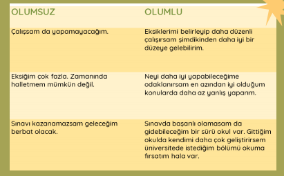 - Düşüncelerini not et ve olumlu - olumsuz olarak ayır. Olumsuzları olumlularla değiştirmeyi dene.